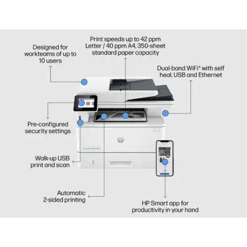 HP Laser Jet Pro MFP 4103FDW Laser JetPrinter -Copier 40 ppm, 512MB, Flat Bed , 50Sh ADF with duplex ADF scanning, Fax, Duplex Wifi, 2.7" Touch screen, USB2*1,Front USB*1, Rear USB*1/ 10/100/100, Processor 1200Mhz, (Replacing M428FDW)